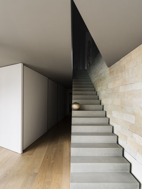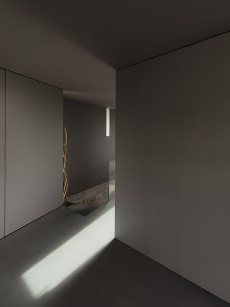 An additional layer of control in the project was the attention given to the dynamic play of natural lines of light and shadow cast on the floor throughout the day. The concrete flooring on the upper level emphasizes and highlights the contrast between light and dark; in the afternoon, boundaries appear sharp and precise. Conversely, the wood flooring on the lower level absorbs and softens these contrasts, creating subtler tones and a more restful atmosphere.
