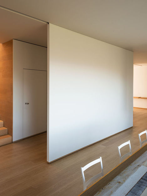 Un grande pannello scorrevole posto dinanzi a noi passata la soglia ha così la duplice funzione di incuriosirci e obbligarci a scegliere un percorso. Salire verso le camere o entrare nella zona giorno. Si crea uno spazio compresso che anticipa gli ambienti dilatati e luminosi della casa.